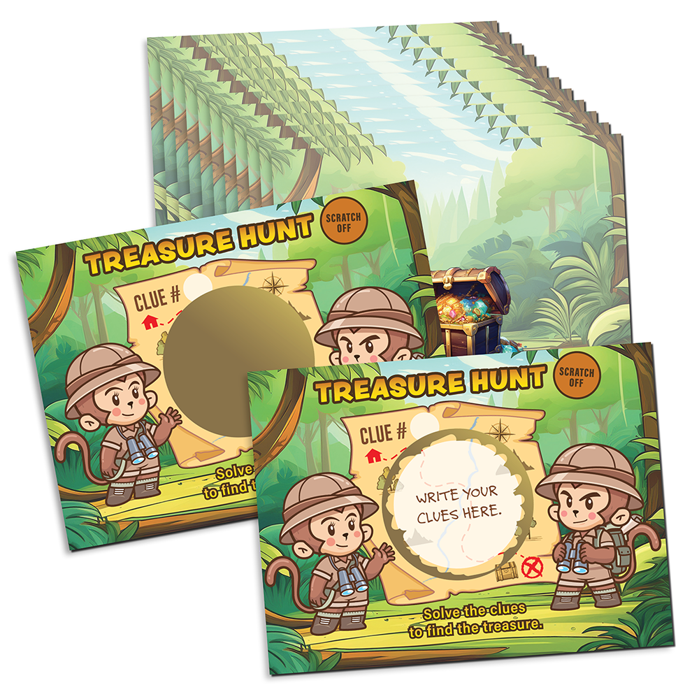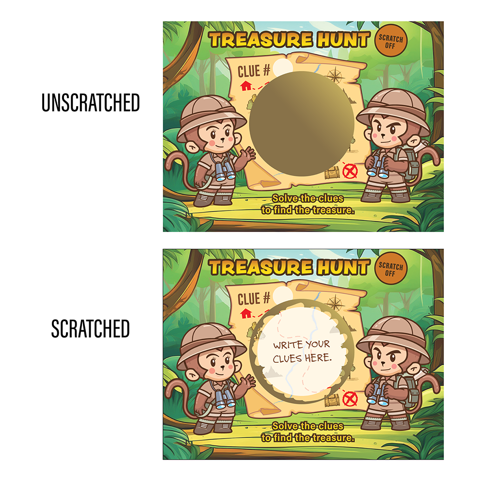 Scavenger Hunts are more exciting with our Treasure Hunt DIY Make Your Own Scratch Off Cards! Each pack has 20 cards and 20 scratch off stickers. Write in your clue in the circle and the clue # in the box at the bottom. Cover the Clue with the scratch off sticker and hand out! Perfect for: Family, Friends, Work Events, Fundraisers, Retirement Communities and more! We absolutely suggest using a coin or one of our Scratcher Chips to scratch!