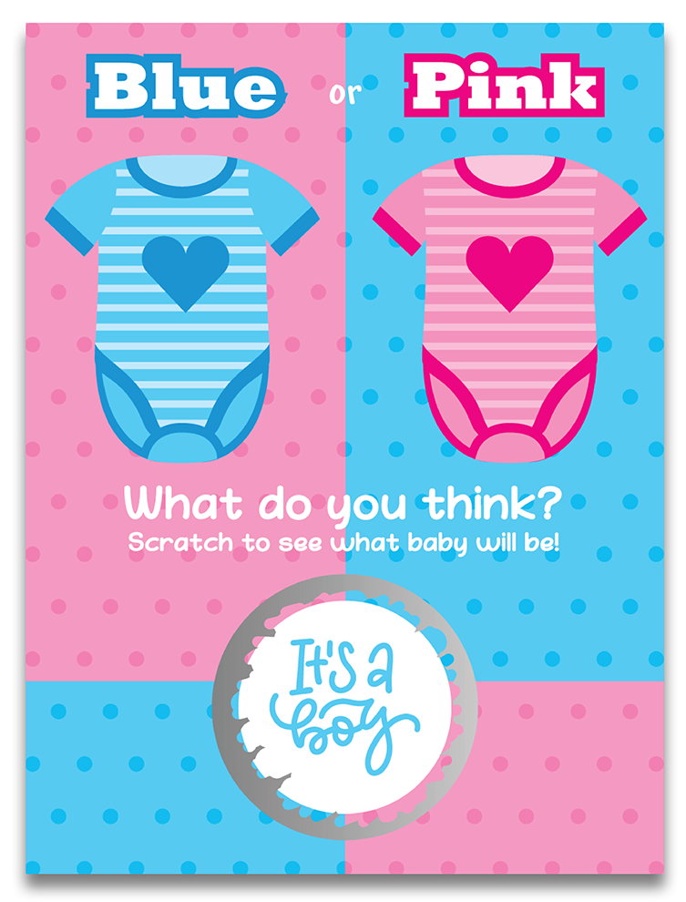 • Les cartes à gratter pour révélation de genre de bébé mesurent 3” x 4”